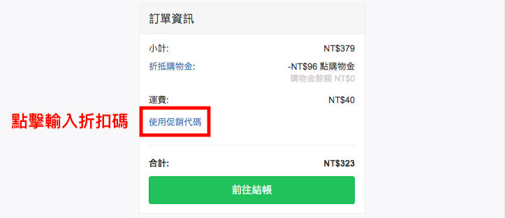 挑選完所有的商品後,按下「訂單結帳」,系統會帶您到「購物車」頁面,請在右下角的「訂單資訊」中點擊「使用促銷代碼」,即可輸入代碼。